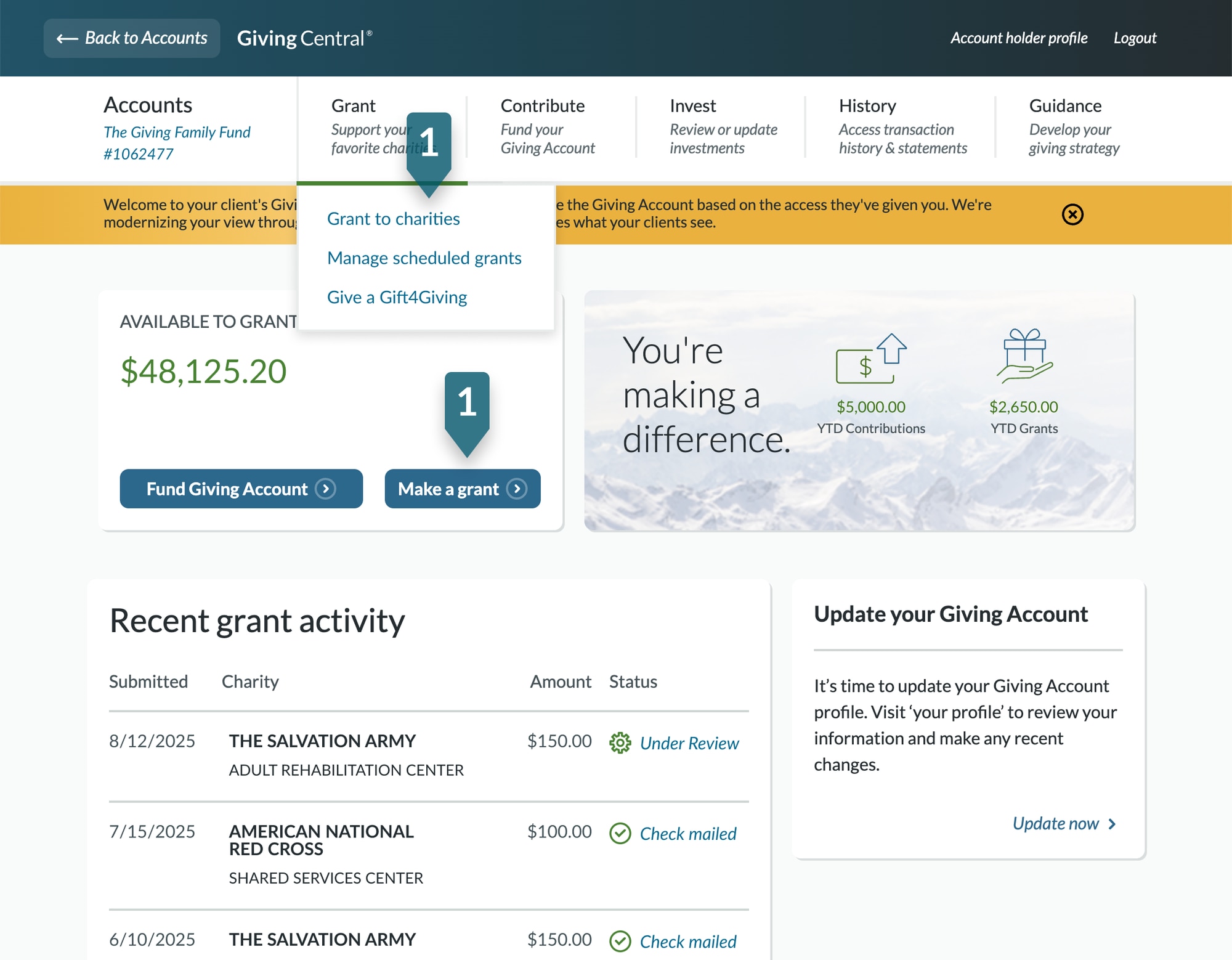 From your GivingCentral dashboard, scroll to Active Giving Account, the list of the Giving Account for which you have transactional access. Select the Giving Account your client intends to use to fund this grant recommendation.
